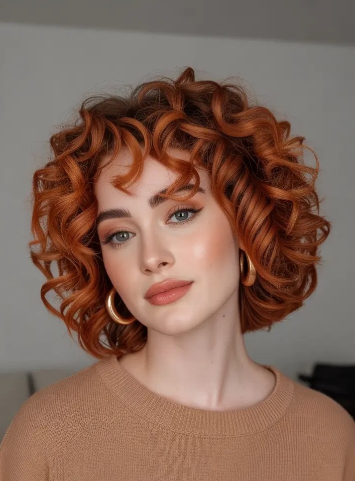 9. Copper Curly Bob with Bangs