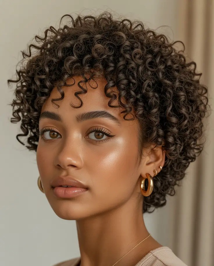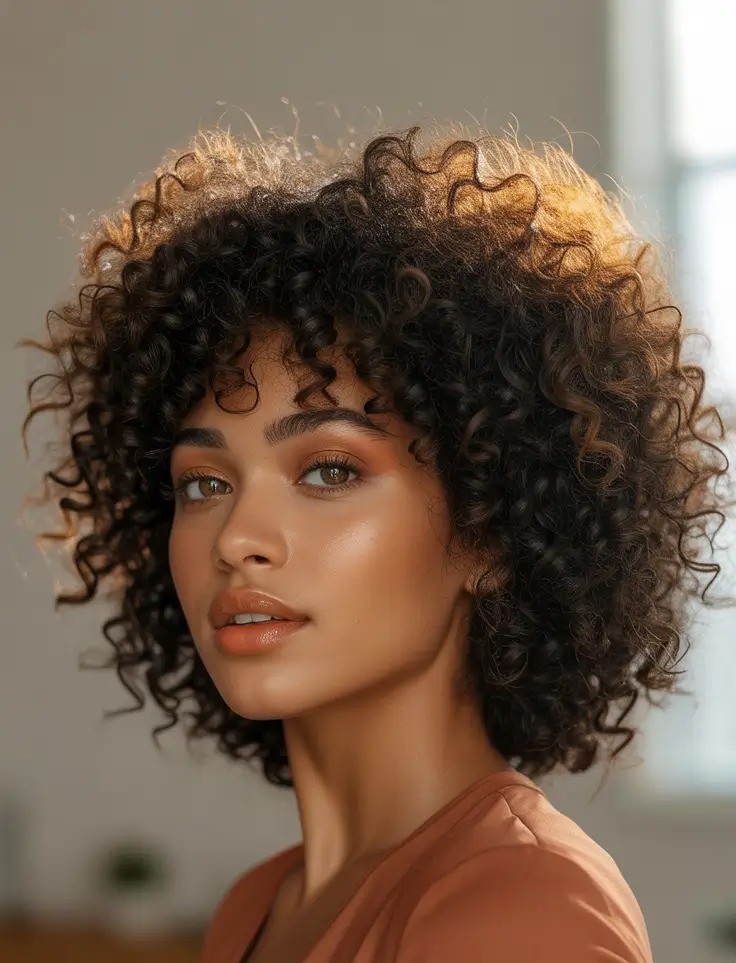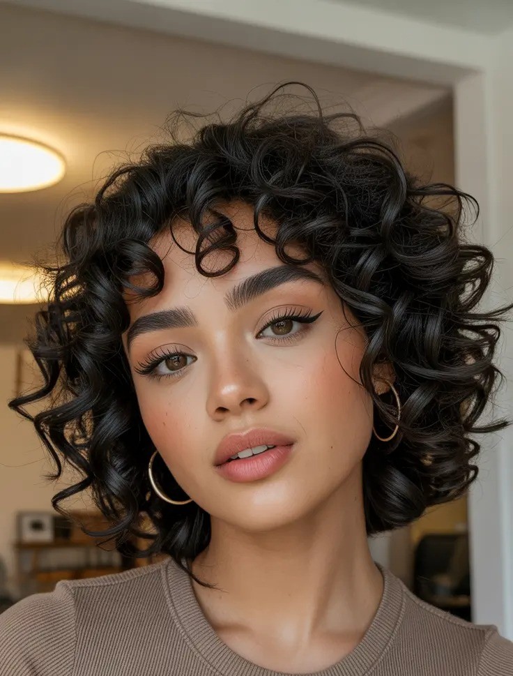 A short curly bob with bangs is the perfect mix of playful volume and modern elegance. This chic curly hairstyle frames the face beautifully while enhancing natural texture and movement. Whether you choose wispy curly fringe or fuller, rounded bangs, this cut delivers effortless style with minimal maintenance.