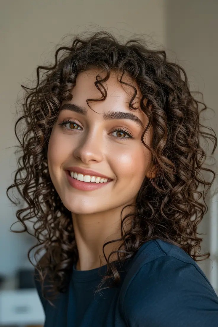 This curly hairstyle blends defined, springy curls with gently feathered bangs that frame the face beautifully. The soft bangs add balance and highlight the eyes while the voluminous curls bring natural texture and dimension. Perfect for medium to long hair, this style enhances your curl pattern without feeling heavy. Light layering keeps the curls airy and full of life.