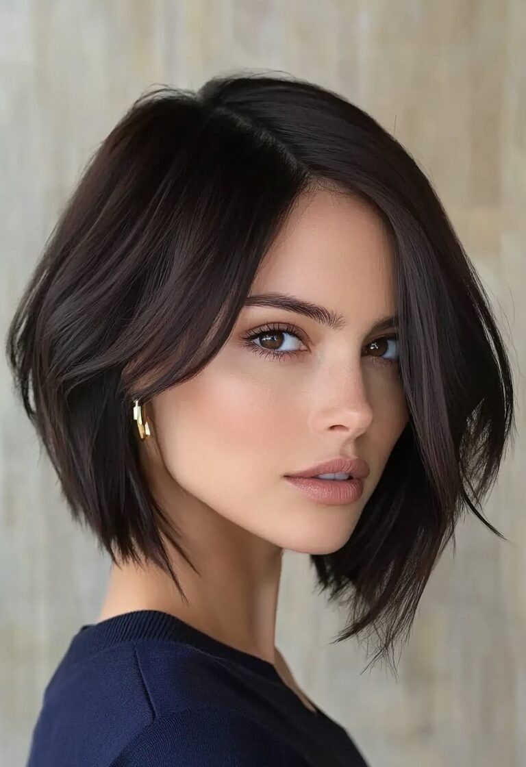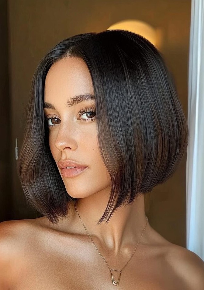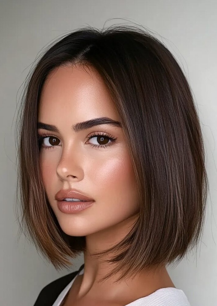 The straight bob haircut is known for its clean, precise lines, this haircut typically falls between the chin and shoulders, creating a polished, sophisticated look. It works best on straight or slightly wavy hair, highlighting shine and healthy texture while framing the face elegantly. The straight bob is highly versatile which is perfect for professional settings, casual outings, or evening events and can be paired with blunt ends, subtle layers, or side parts for added style.