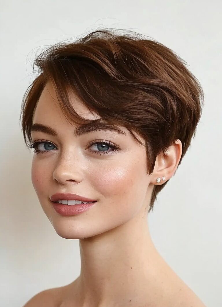 This pixie style features longer layers on top that sweep gracefully to one side, creating a soft, feminine frame for the face. It works beautifully on fine to medium hair, adding volume, texture, and effortless movement. The side-swept pixie is versatile which allows for sleek, polished looks or tousled, playful styles. Ideal for women seeking a bold yet elegant transformation, this haircut highlights facial features, complements all face shapes, and delivers a low-maintenance, fashion-forward look that exudes confidence.