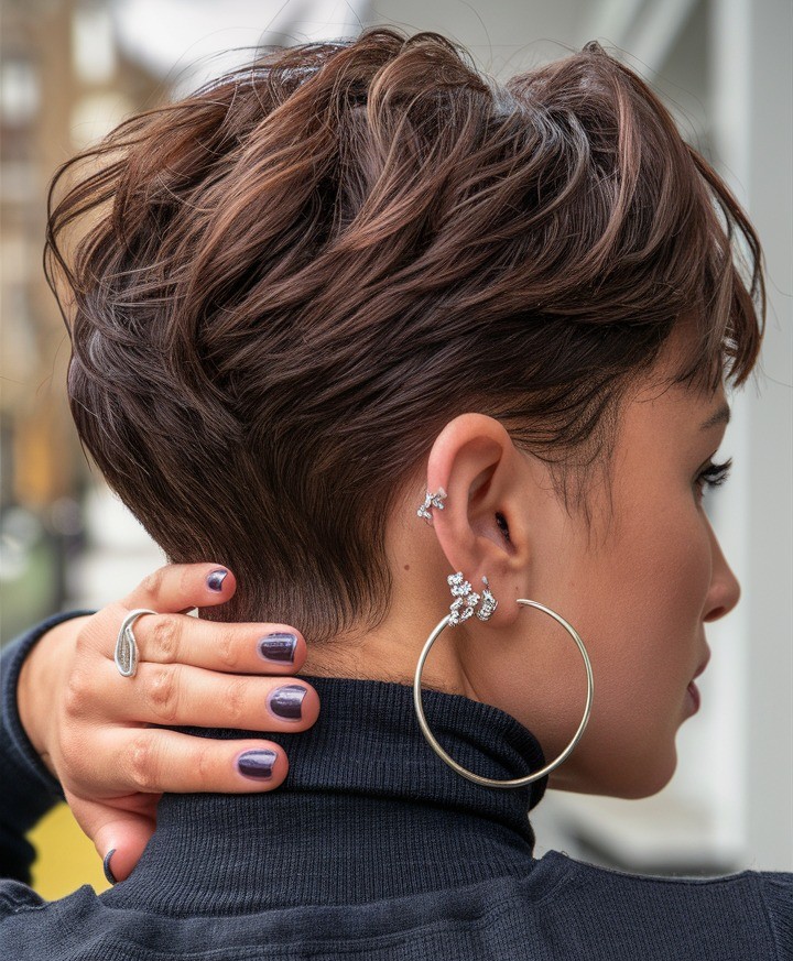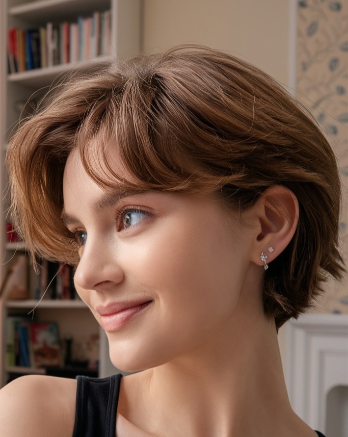 Featuring finely blended layers, this style adds subtle volume, natural movement, and a lightweight feel without appearing bulky. It’s especially flattering for fine hair, as delicate layering creates a fuller appearance. This pixie cut enhances facial features while maintaining a graceful silhouette.