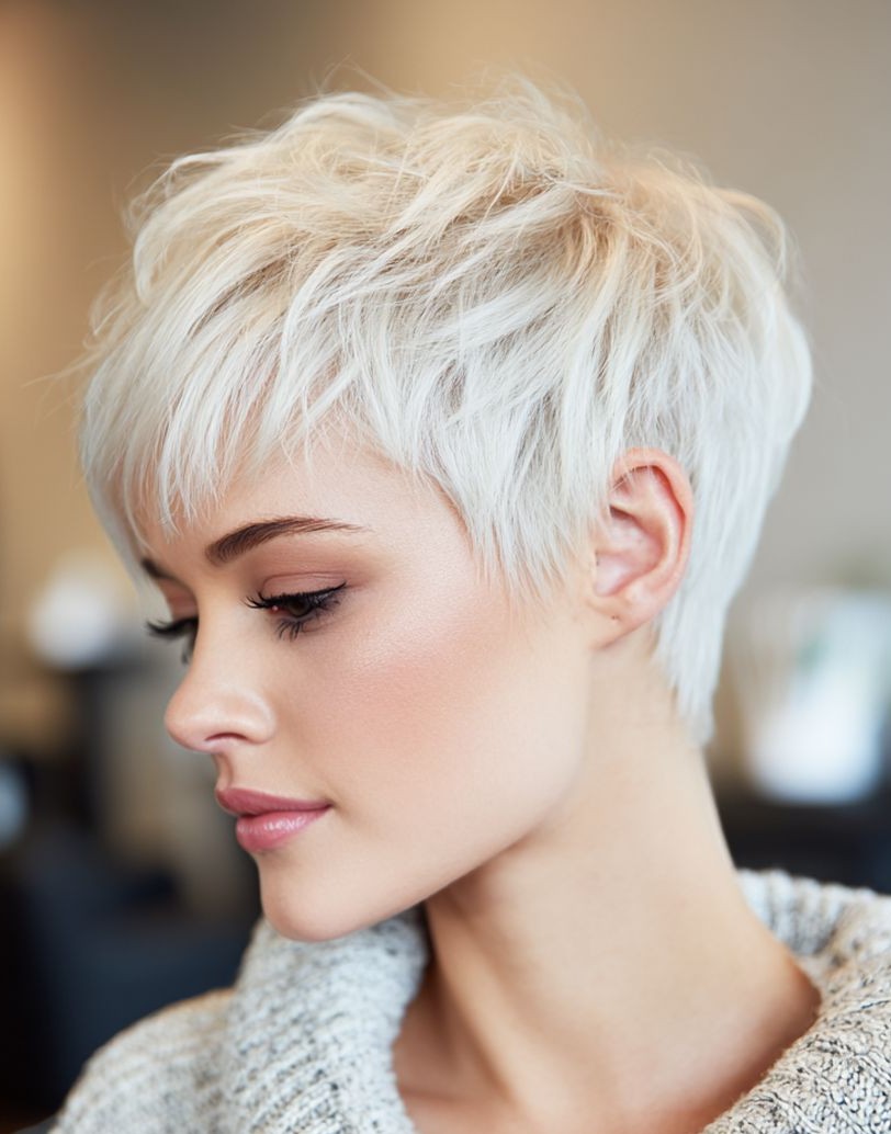 This is a bold, ultra-modern hairstyle that combines a crisp platinum-blonde shade with a chic pixie cut. This striking look highlights facial features, enhances skin tone, and adds a cool edge. Perfect for straight to slightly wavy hair, an icy blonde pixie delivers a clean, luminous finish while emphasizing texture and shape. Though the color requires regular toning, the payoff is a sleek and high-impact style.