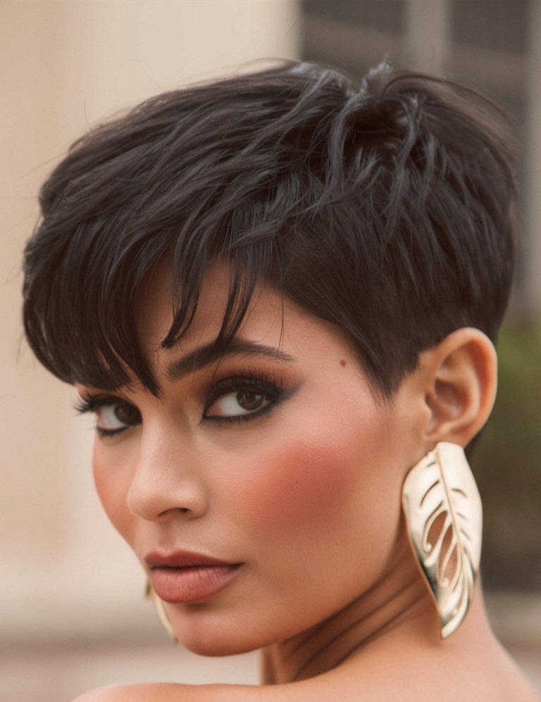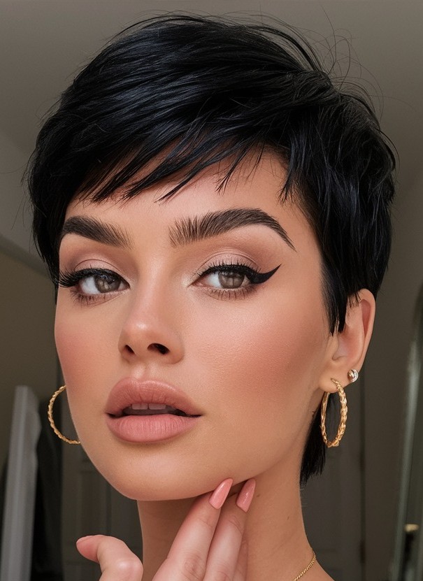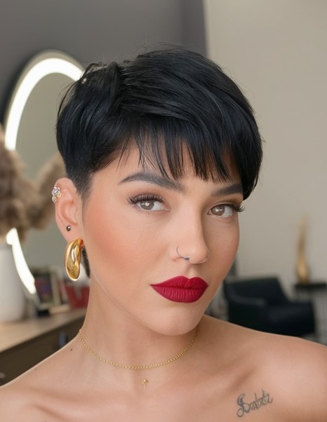 The sleek black pixie cut is the epitome of polished sophistication and modern elegance. Featuring smooth, glossy strands and a sharply defined silhouette, this cut accentuates facial features and bone structure beautifully. Whether worn sleek and classic or slightly textured for a contemporary twist, the sleek black pixie cut exudes confidence, and understated glamour while making it a go-to choice for anyone seeking a bold, refined, and stylish short hairstyle.