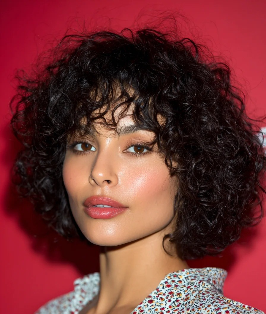 This is a chic hairstyle that highlights natural curls while adding a soft frame around the face. The bob’s length sits just above the shoulders, giving movement and bounce while the bangs gently contour the forehead and enhancing facial features.
