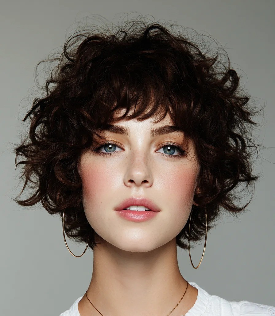 Step into style with a tousled short curly shag with bangs that’s equal parts edgy and effortless. The textured layers amplify your natural curl pattern, giving hair volume and life while wispy bangs soften your features for a flattering finish. Low-maintenance and versatile, this haircut works for all curl types and adds instant personality to your look.