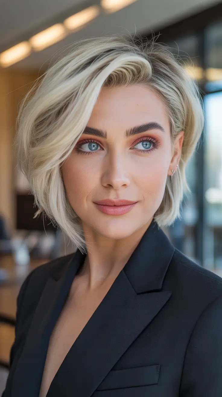 The bob’s length, ideally falling just below the chin or at shoulder level, elongates the face while side-swept bangs draw attention to the eyes and create soft angles, minimizing roundness. Light layers or subtle texturing add movement, preventing the hairstyle from looking too heavy. A bob with side bangs is the perfect short haircut for enhancing round facial features.