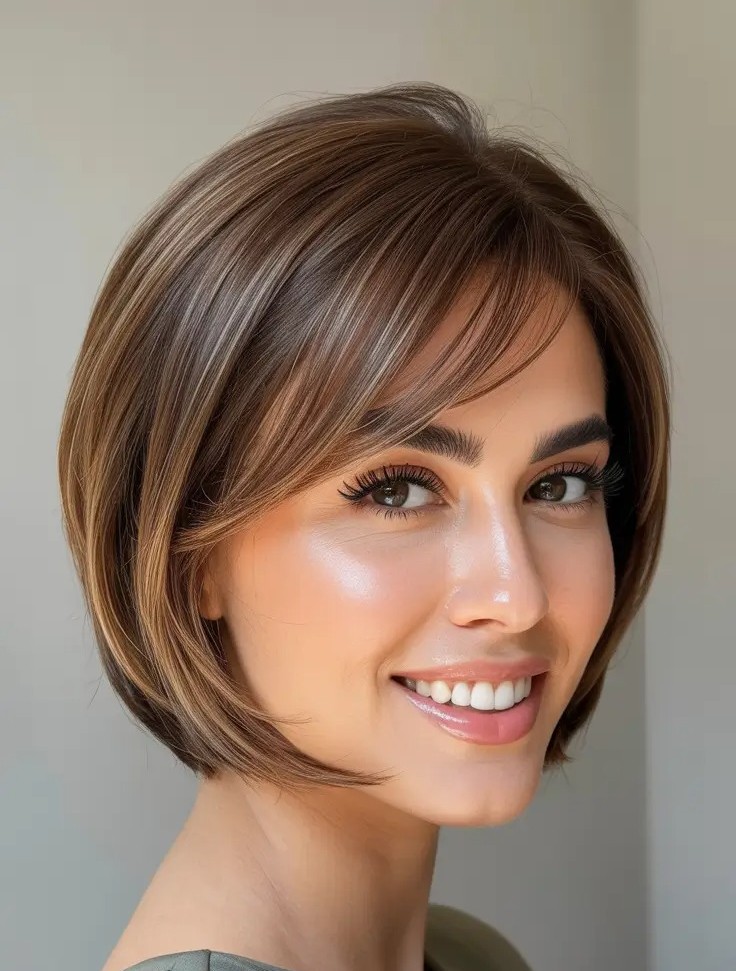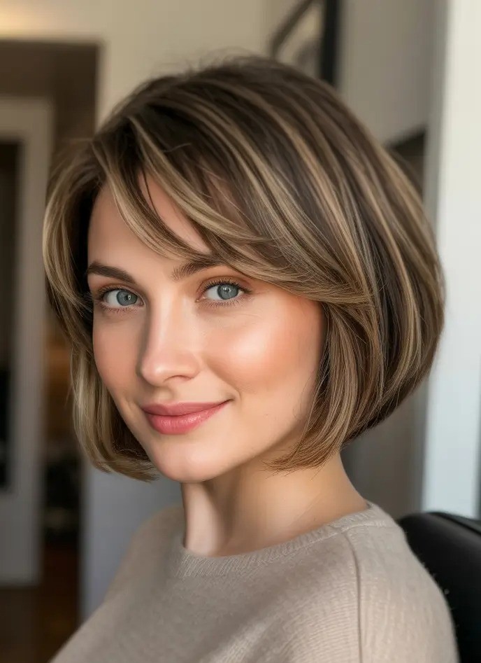 The mix of brown and blonde tones adds depth and dimension which creates a radiant effect. Soft, subtle layers frame the face, gently slimming and balancing round contours. A slightly longer front or angled cut elongates the jawline while the classic bob length keeps the style modern and versatile.