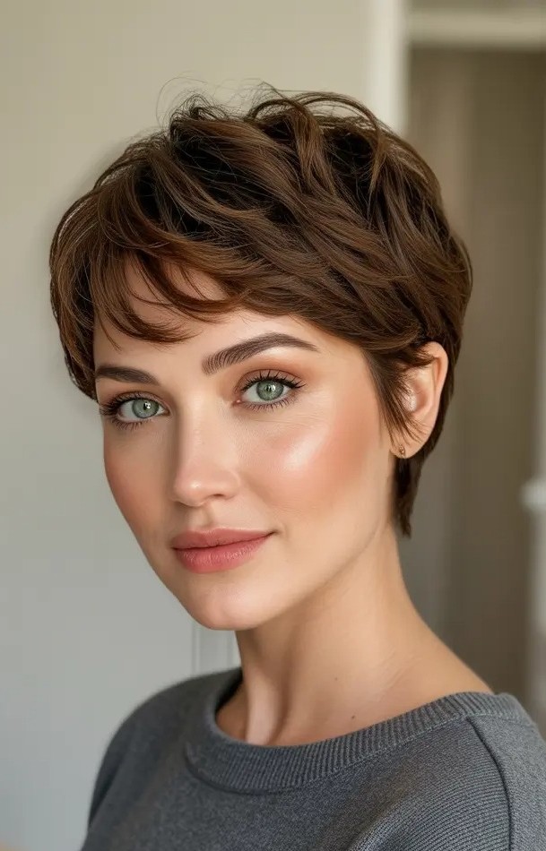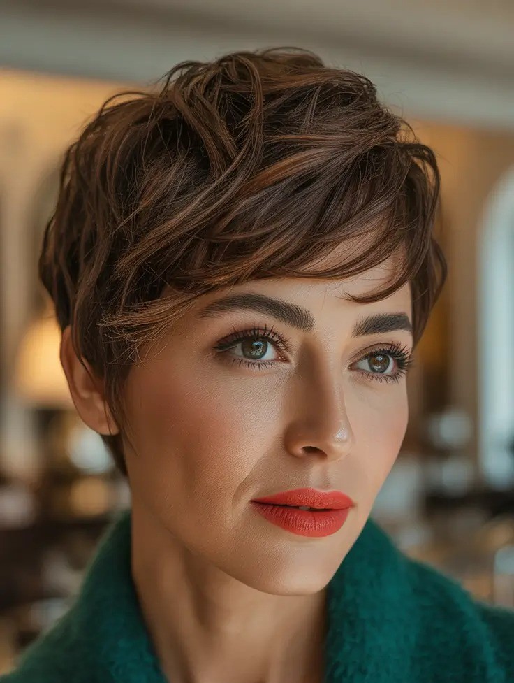 Revamp your style with a brunette pixie with gentle waves which is a perfect match for round faces. Soft, flowing waves add texture and movement, creating the illusion of a slimmer and longer face. The cropped sides provide structure while wavy layers on top bring effortless volume and a touch of playful elegance. This versatile pixie works beautifully whether styled sleek and polished or tousled for a carefree vibe. The deep brunette hue adds richness and warmth while highlighting your features naturally.