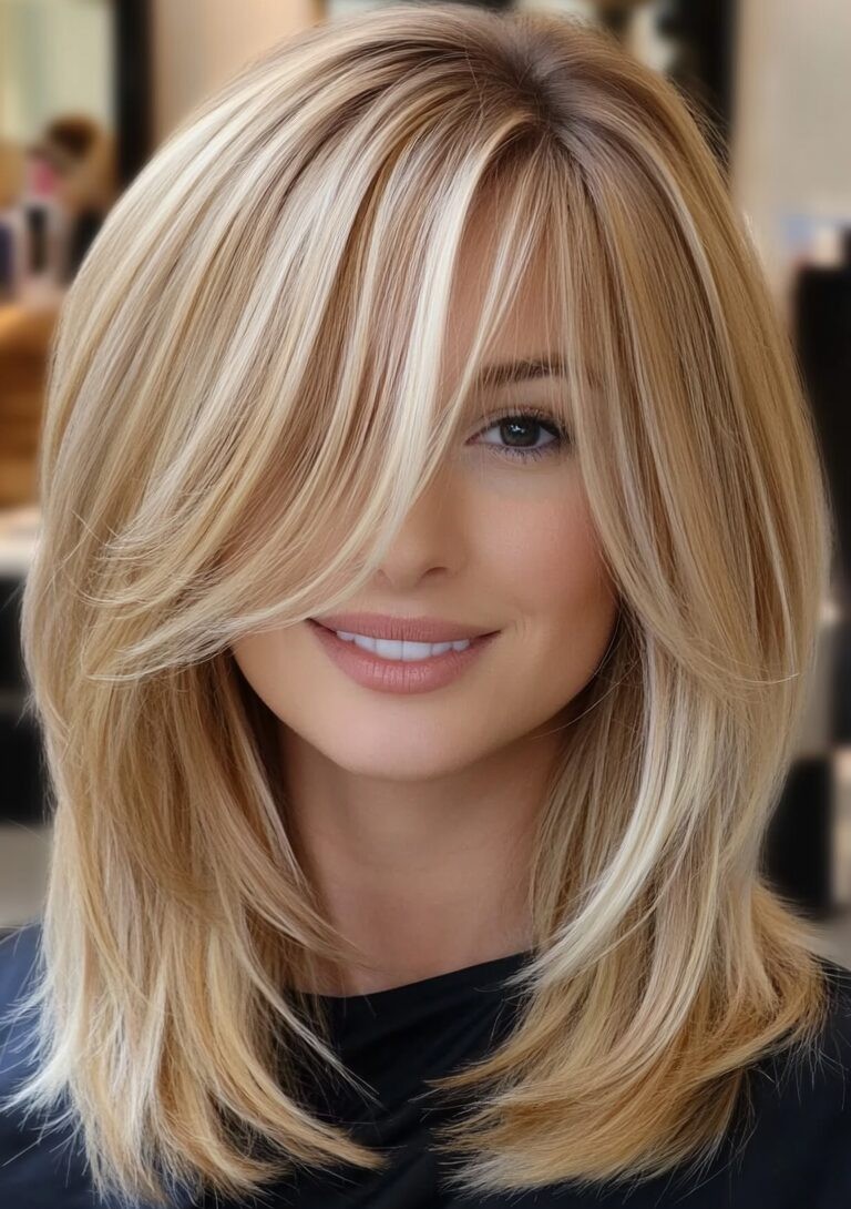 This style combines a bright blonde base with natural-looking darker roots while creating a soft gradient that grows out beautifully and reduces frequent touch-ups. Perfect for shoulder-length hair, the lob enhances movement, texture, and volume while making it ideal for waves, curls, or sleek straight styles. The contrast between dark roots and blonde ends adds depth and dimension, flattering all skin tones.