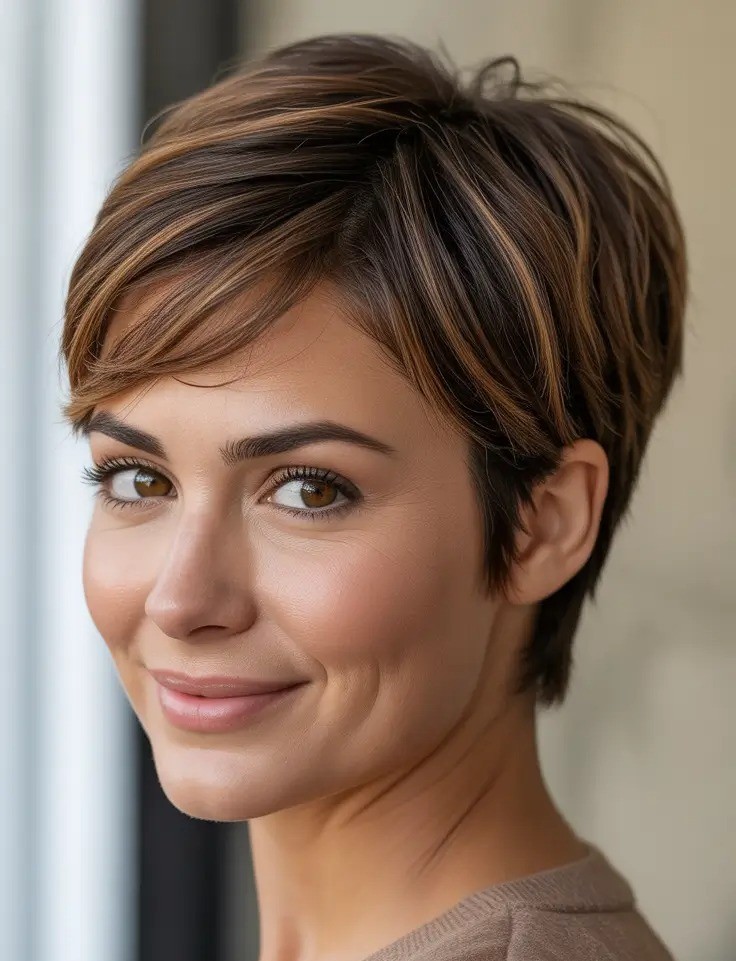 6. Highlighted Pixie with Side Swept Bangs