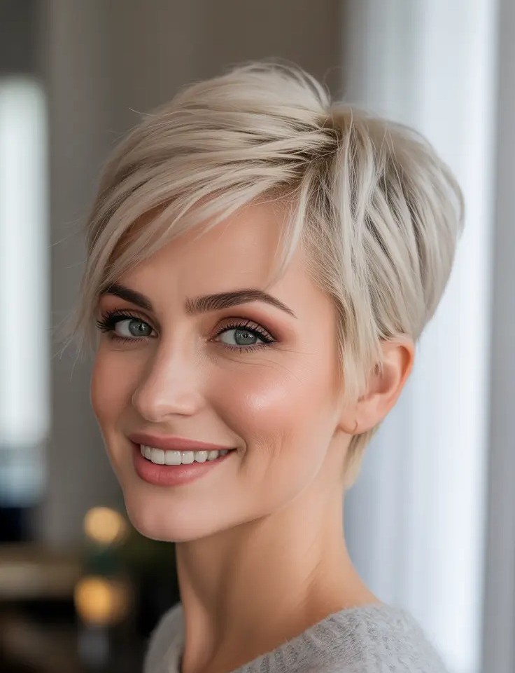The highlighted pixie with side swept bangs is a dimensional haircut that blends softness with modern edge. Short, textured layers create volume and movement while subtle highlights add depth and brightness throughout the cut. The side swept bangs gently frame the face, softening features and drawing attention to the eyes and cheekbones. Blow-dry the bangs to the side for a polished finish or add light texture for a more relaxed vibe.
