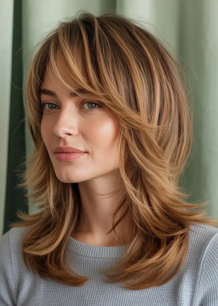 The layered caramel shag haircut with swept bangs is a warm, dimensional style that feels effortlessly modern. Soft, textured layers create movement and volume while the rich caramel tones add depth and shine. The swept bangs gently frame the face, blending seamlessly into the layers for a flattering, face-softening effect. This cut works beautifully on medium to thick hair and enhances natural waves or loose curls.