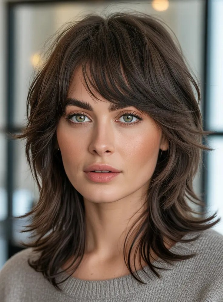 The medium length shag with piecey bangs is the ultimate cool-girl haircut. This layered style adds instant movement, volume, and texture while keeping enough length for versatile styling. The shag cut creates soft, feathered layers throughout while piecey bangs fall lightly across the forehead for a relaxed, effortless vibe. It works beautifully on straight, wavy, or slightly curly hair and flatters most face shapes by adding dimension and softness.