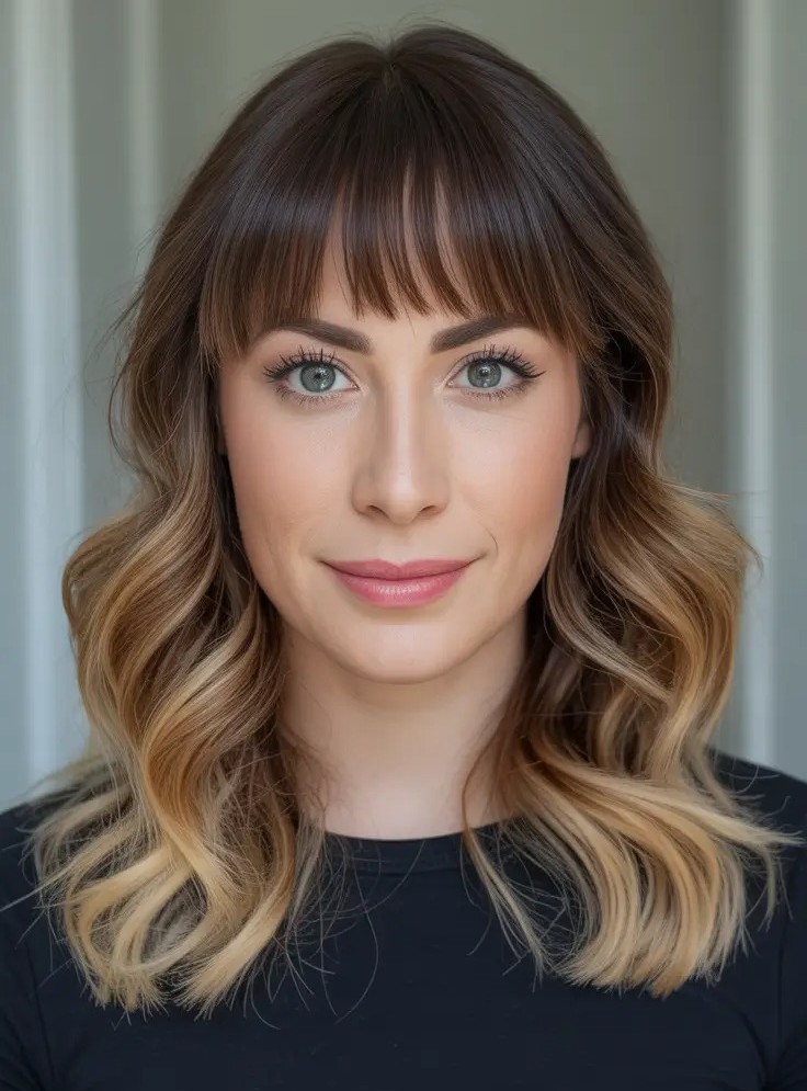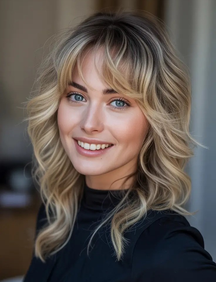 The shoulder-grazing waves create natural volume and texture while the curtain bangs gently frame the face, opening up the eyes and softening facial features. This style works beautifully on fine, medium, or thick hair and suits most face shapes which makes it versatile and wearable.