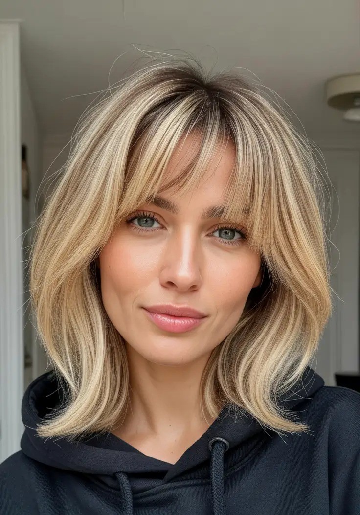 This shoulder-grazing cut flows with soft, feathered layers that frame your face perfectly while the airy curtain bangs add a touch of flirty elegance. Sun-kissed blonde tones catch the light while creating natural dimension and a radiant glow.