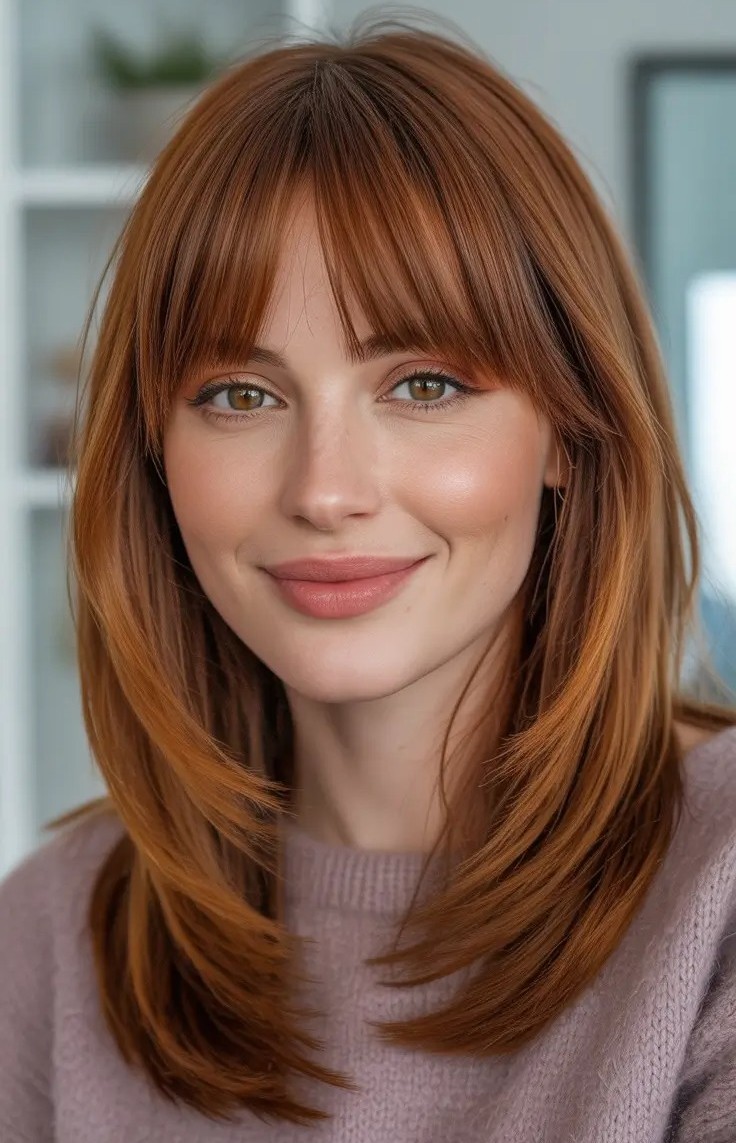 18. Copper Medium Length Haircut with Sleek Bangs