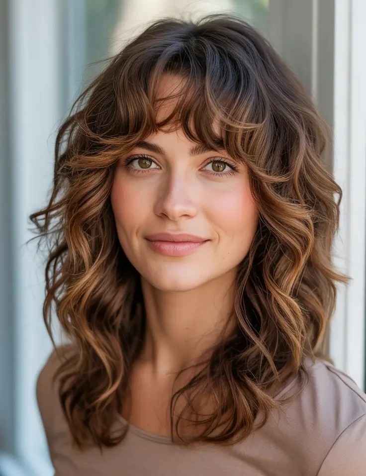 This curly shag celebrates natural volume and movement. Bouncy, face-framing bangs add a youthful twist while layers keep curls lively and full of personality.