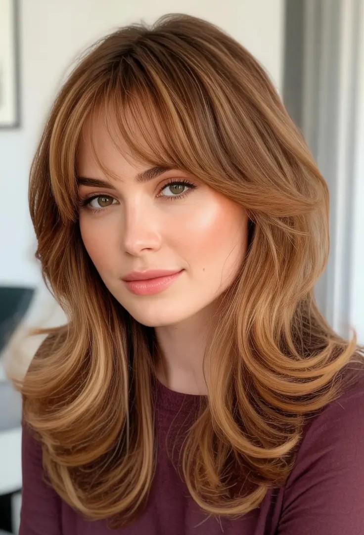 11. Golden Caramel Layered Hair with Curtain Bangs