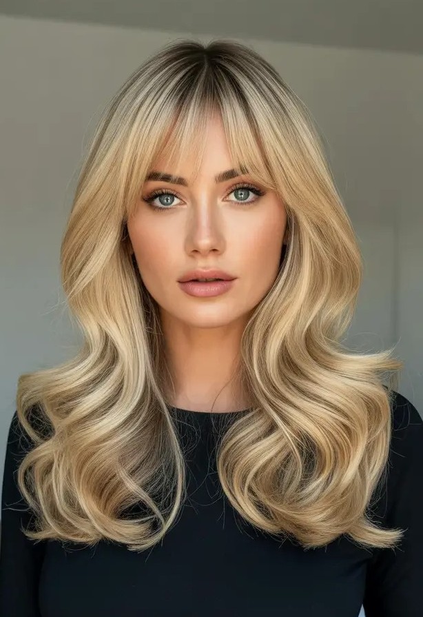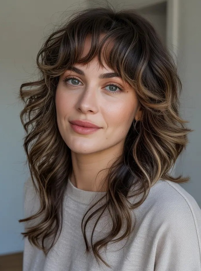 The long wavy hairstyle with full bangs is a bold, glamorous look that blends volume, texture, and statement fringe. This style works beautifully on straight or wavy hair and suits oval, heart-shaped, and long face shapes. For a polished finish, style the waves with a curling iron, or let them air-dry for an effortless vibe.