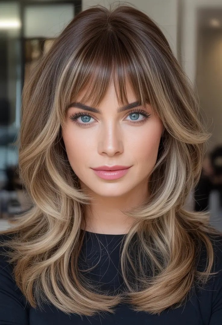 13. Long Layered Hairstyle with Face-Framing Bangs