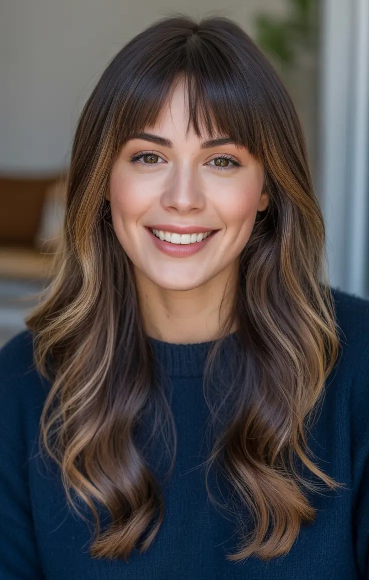 15. Long Wavy Hairstyle with Full Bangs