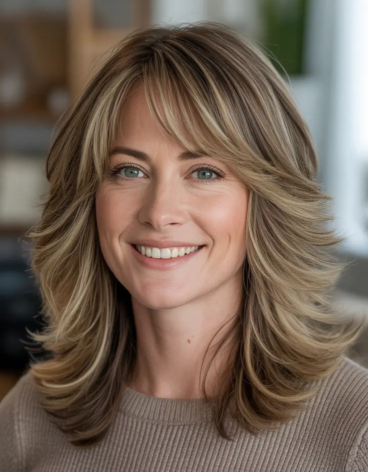 14. Medium Length Layered Haircut with Feathered Bangs