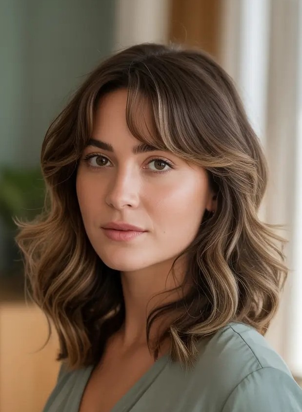 This shoulder-grazing cut features soft, natural waves that add volume and movement while giving hair a textured look. The curtain bangs frame the face beautifully, softening features while drawing attention to the eyes and cheekbones. Its versatility makes it a low-maintenance yet chic choice, perfect for everyday wear or special occasions, keeping you on-trend with minimal effort.