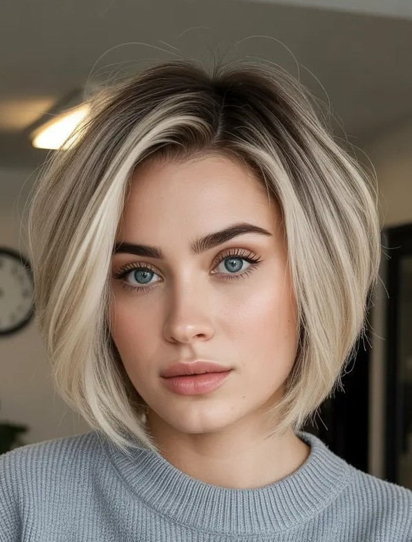 This style features a sharp, clean line that frames the face which enhances facial features while giving a sophisticated vibe. The French bob adds effortless elegance and is perfect for medium to fine hair textures. The ash blonde shade adds dimension, softens the look, and balances the boldness of the cut.