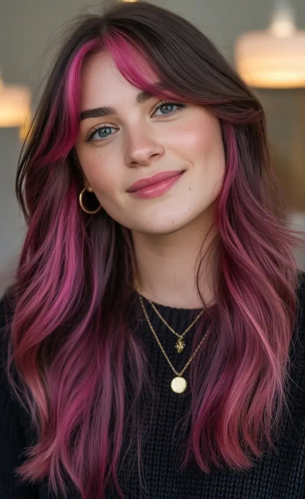 Brown hair with magenta balayage is a bold and vibrant way to add dimension and personality to your hairstyle. Deep brown roots transition seamlessly into rich magenta tones at the mid-lengths and ends while creating a multidimensional effect that catches the light beautifully. It’s ideal for anyone wanting a colorful, head-turning hairstyle that expresses individuality and modern style.
