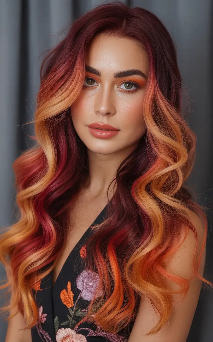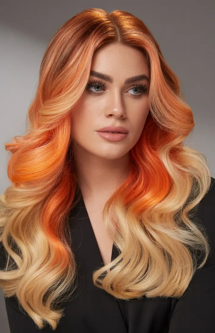 Rich copper tones transition seamlessly into soft blonde tips which creates a fiery effect that catches the light beautifully. Whether worn straight, wavy, or curly, the blend of orange and blonde adds energy and sophistication. Orange copper balayage with blonde ends is ideal for anyone seeking an eye-catching hair color that radiates warmth and personality.