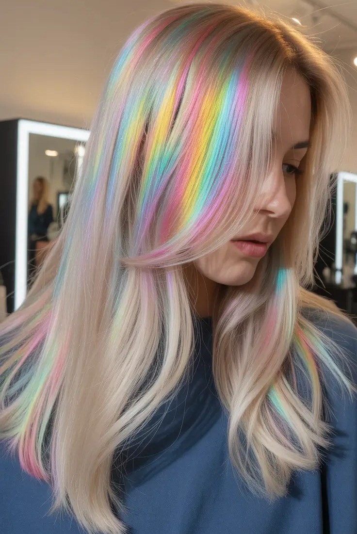 It is an eye-catching hairstyle that blends soft, dreamy colors for a multidimensional effect. Hand-painted balayage transitions seamlessly from icy platinum roots to pastel pinks, blues, purples, and yellows at the mid-lengths and ends while creating a whimsical look. Pastel rainbow balayage on platinum blonde adds a fun, artistic flair while remaining sophisticated.