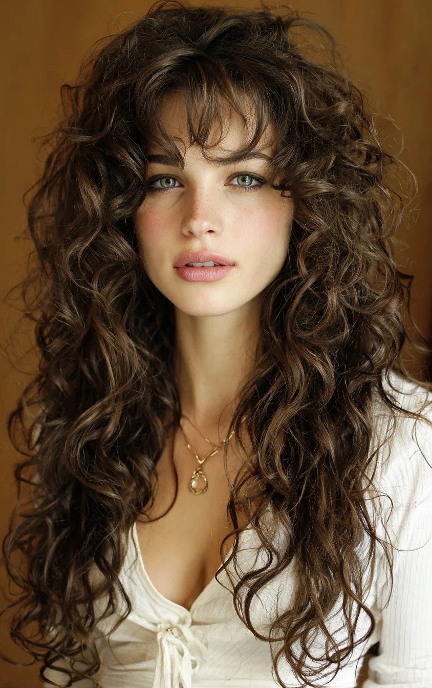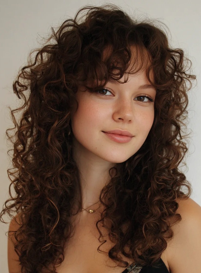 Bangs frame the face beautifully while cascading curls add natural volume, bounce, and movement. This versatile look works for all curl types, from soft waves to tight coils, and can be enhanced with layers, highlights, or balayage for extra dimension. Long curly hair with bangs exudes confidence and personality while making every curl a style statement.