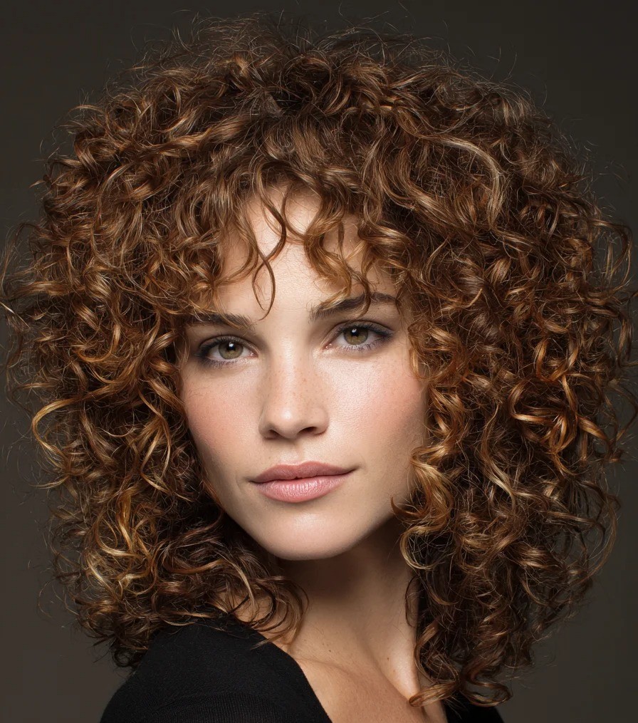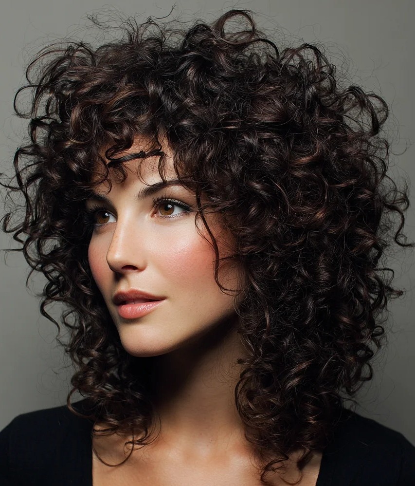 Soft bangs gently frame the face, adding a touch of elegance while enhancing natural curl patterns. Layers throughout mid-length curls create volume, movement, and bounce while making the style easy to manage and flattering for all face shapes.