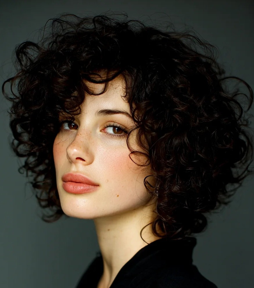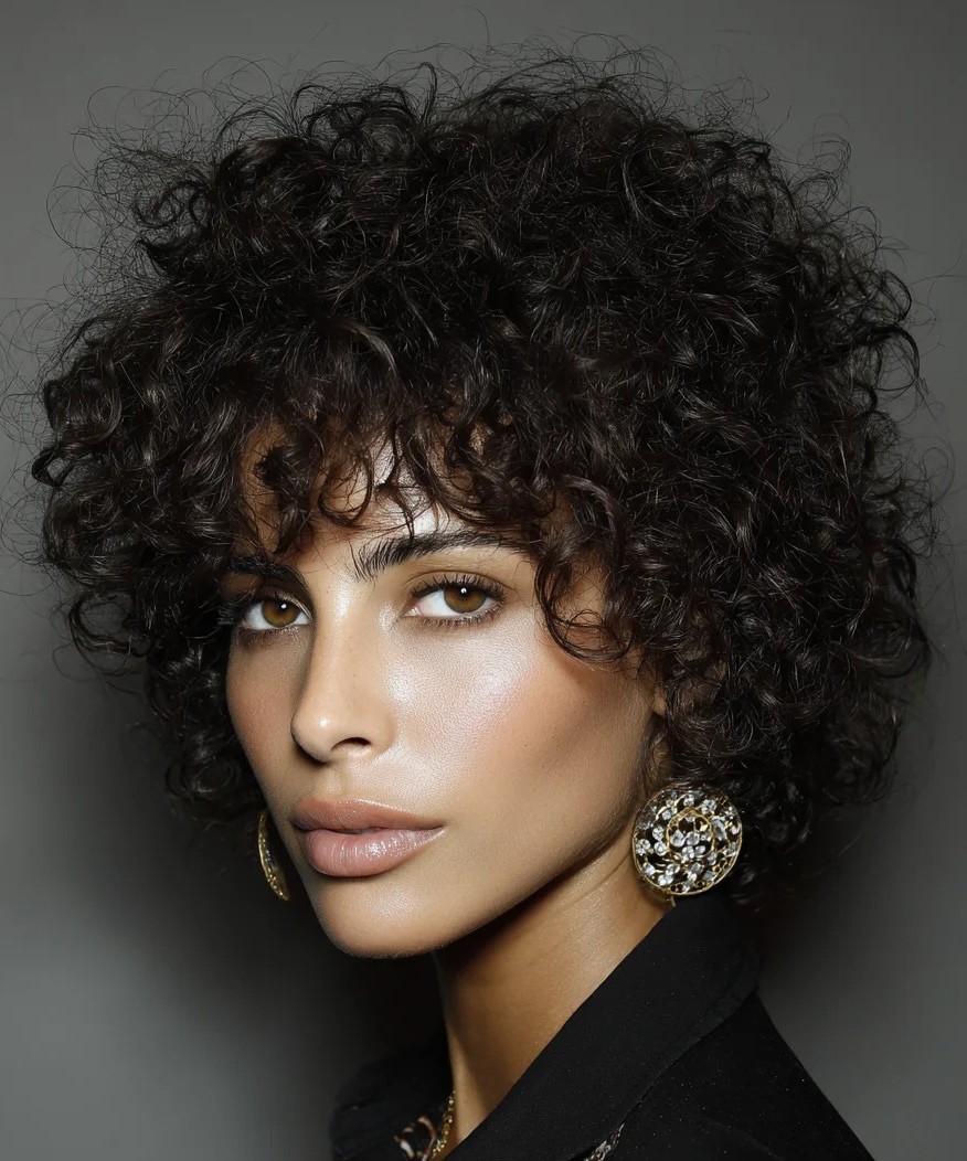 The short curly bob with micro bangs is a daring, and modern hairstyle that instantly elevates your look. Micro bangs add a playful, edgy touch while highlighting facial features, and the bob’s natural curls provide bounce, texture, and volume. This versatile style works with various curl types, from soft waves to tight ringlets, and can be dressed up or down for any occasion.