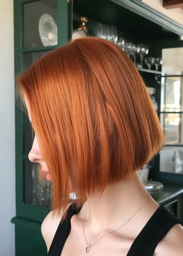 This is a modern hairstyle that combines sharp angles with vibrant warmth. Cut shorter at the back and gradually longer in the front, this angled bob creates a sleek, face-framing shape with added movement. The bold copper-orange hue enhances shine and dimension while giving the hair a radiant finish. This style is easy to maintain while delivering high-impact style.