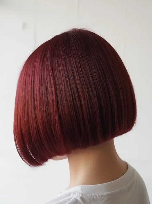 The crimson red stacked bob haircut is a fashionable and daring hairstyle that emphasizes shape and color. With a stacked back and graduated layers, it adds movement, volume, and a dynamic look. Perfect for straight, wavy, or slightly textured hair, this bob offers low-maintenance styling while maintaining a bold and edgy appearance.