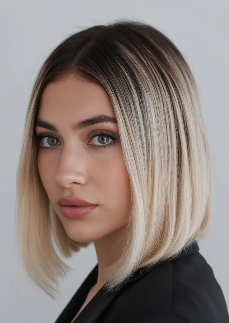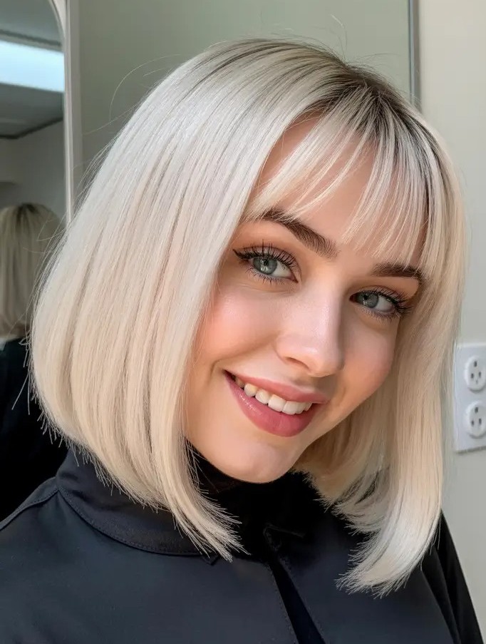 This straight, polished bob features soft or blunt bangs that frame the face perfectly while showcasing smooth and shiny hair. The cool platinum blonde shade adds brightness, dimension, and a striking, luminous effect that flatters fair to medium skin tones.