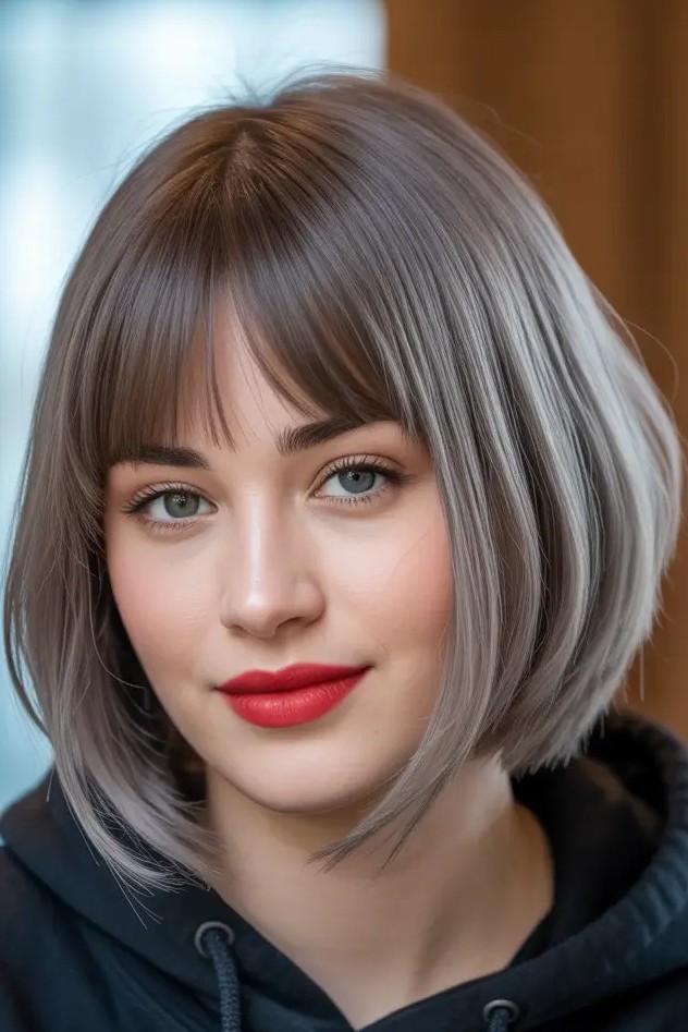 The smoky silver bob haircut with full bangs is a bold, sophisticated hairstyle that blends modern elegance with edgy appeal. This sleek bob features a clean, structured shape paired with full bangs that frame the face and highlight the eyes. The smoky silver shade adds depth, dimension, and a cool-toned metallic finish while making it perfect for a high-fashion look.