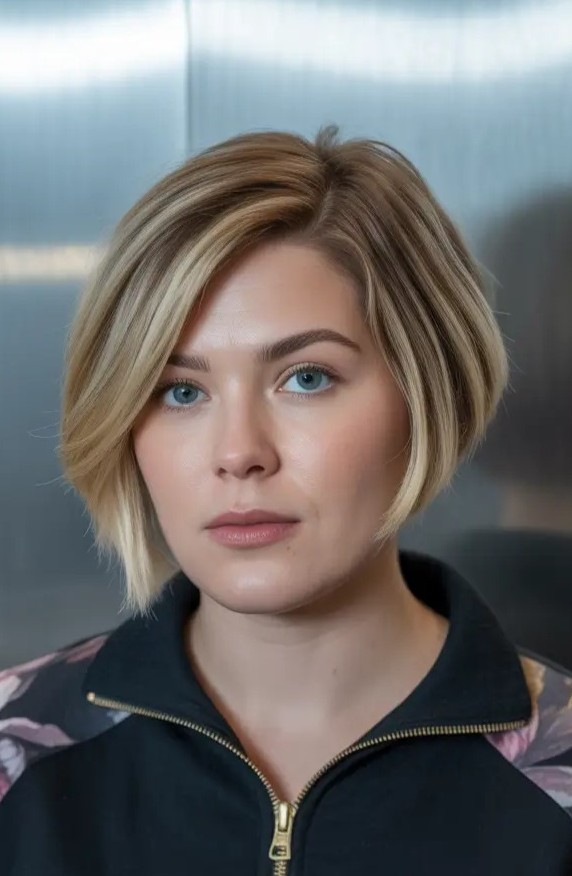 The asymmetrical bob with blonde highlights is a stunning choice for round faces. The slightly longer side and angled cut create the illusion of length, balancing fuller cheeks and soft jawlines. Blonde highlights add brightness and dimension, drawing attention away from roundness while enhancing the hair’s texture. This style works well on straight or subtly wavy hair which makes it versatile and modern. Pair it with a side part or soft layers for added structure.