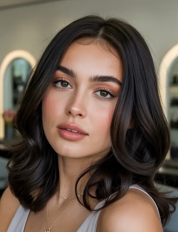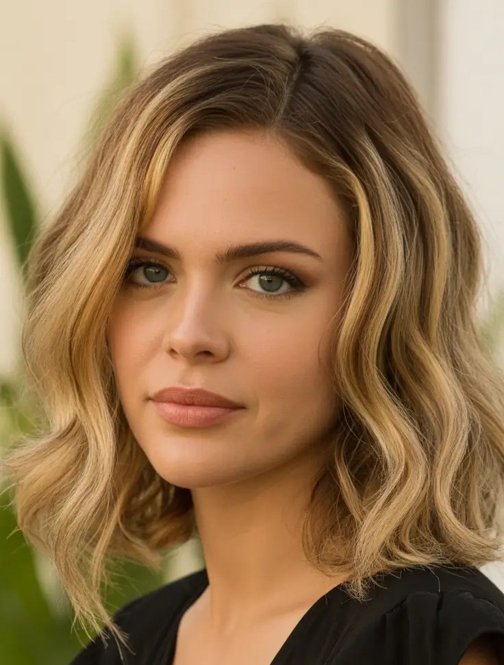 A shoulder-length wavy hairstyle is perfect for round faces, adding texture and movement without emphasizing fullness. Soft waves create vertical lines that elongate the face while the shoulder-grazing length balances the cheeks and jawline. Pairing this style with a side part or subtle layers enhances dimension and prevents the face from appearing wider.