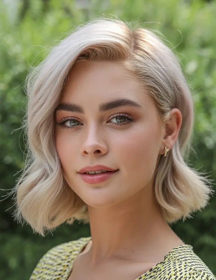 Soft, tousled waves add texture and movement, helping to slim the cheeks and elongate the face while the light blonde tones brighten the overall look. A bob that falls at or just below the chin balances the natural curves of a round face, and a subtle side part enhances dimension and prevents symmetry from emphasizing roundness.