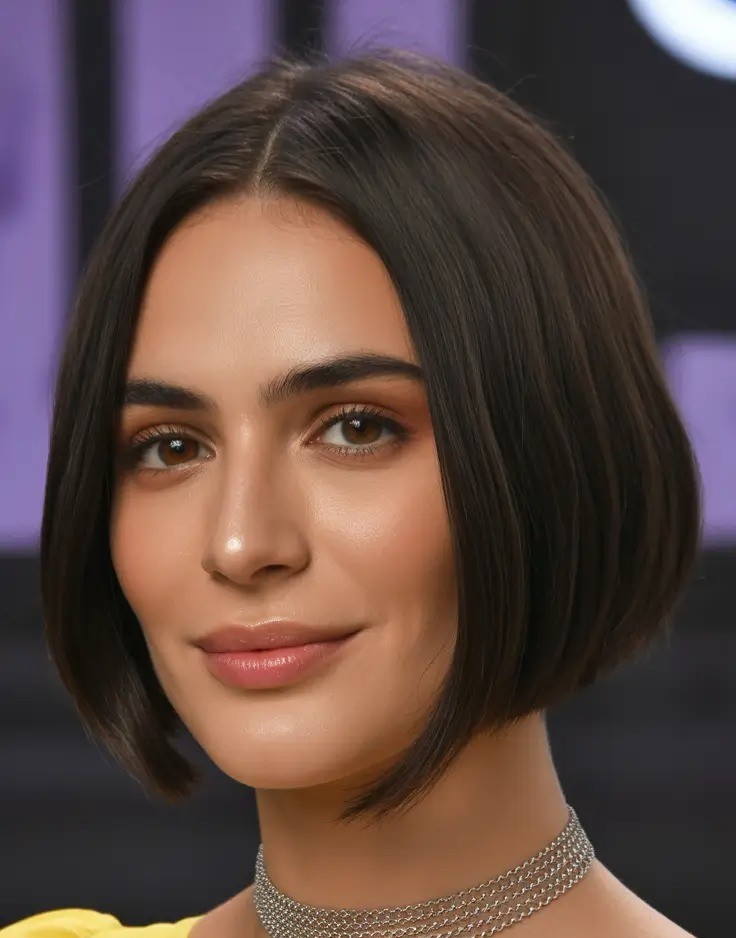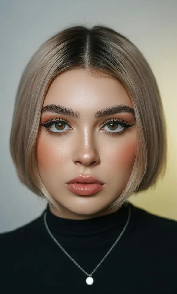 Its straight, precise edges add structure while the center part creates vertical lines that visually elongate the face and balance fuller cheeks. Choosing a length that grazes the chin or falls just below the shoulders prevents added width, and subtle layers or textured ends keep the style dynamic. This versatile haircut offers a polished, stylish look that enhances round face shapes with effortless elegance.