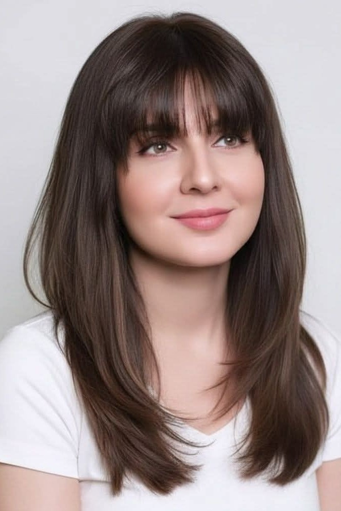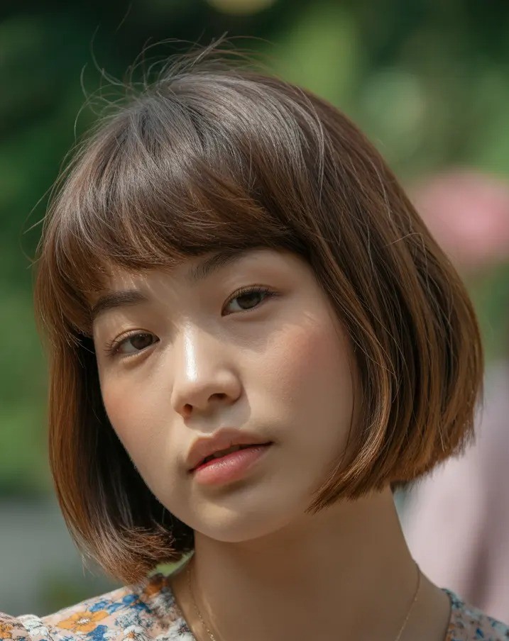 The classic bob with full bangs can be surprisingly flattering for round faces when styled thoughtfully. Choosing a slightly longer bob that grazes the chin helps elongate the face while full bangs add a stylish edge. To balance roundness, opt for soft, wispy bangs rather than blunt, heavy ones, and consider a subtle side part to create dimension. Sleek or slightly textured styling adds structure and prevents the face from appearing wider.