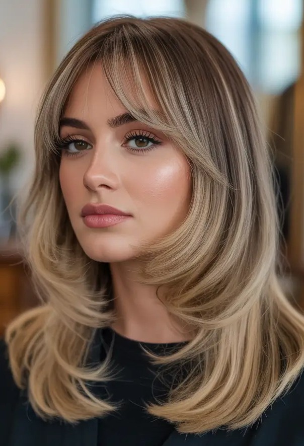 Soft, layered feathering around the face creates vertical lines that elongate the cheeks and jawline which gives the face a slimmer appearance. Medium length which is usually shoulder-grazing—offers versatility, allowing for both sleek straight styling and loose, textured waves. Side-swept layers or a subtle side part add dimension and prevent the face from looking wider. The feathered medium cut moves naturally while highlighting your features.