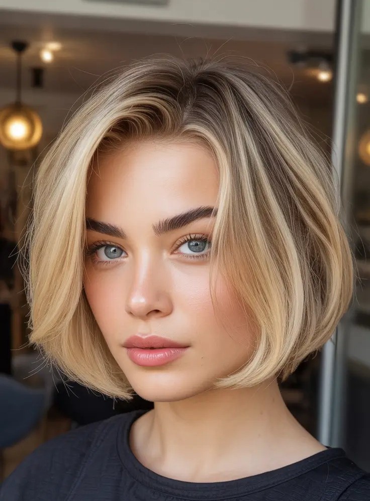 Gentle, face-framing layers create vertical lines that elongate the face while softening fuller cheeks. Blonde highlights add brightness and depth, emphasizing the layers and giving the hair a lively and dynamic look. A bob that hits at the chin or just below the shoulders balances facial proportions without adding width. This versatile cut is highlighting natural features and giving round-faced individuals a fresh, stylish, and sophisticated appearance.
