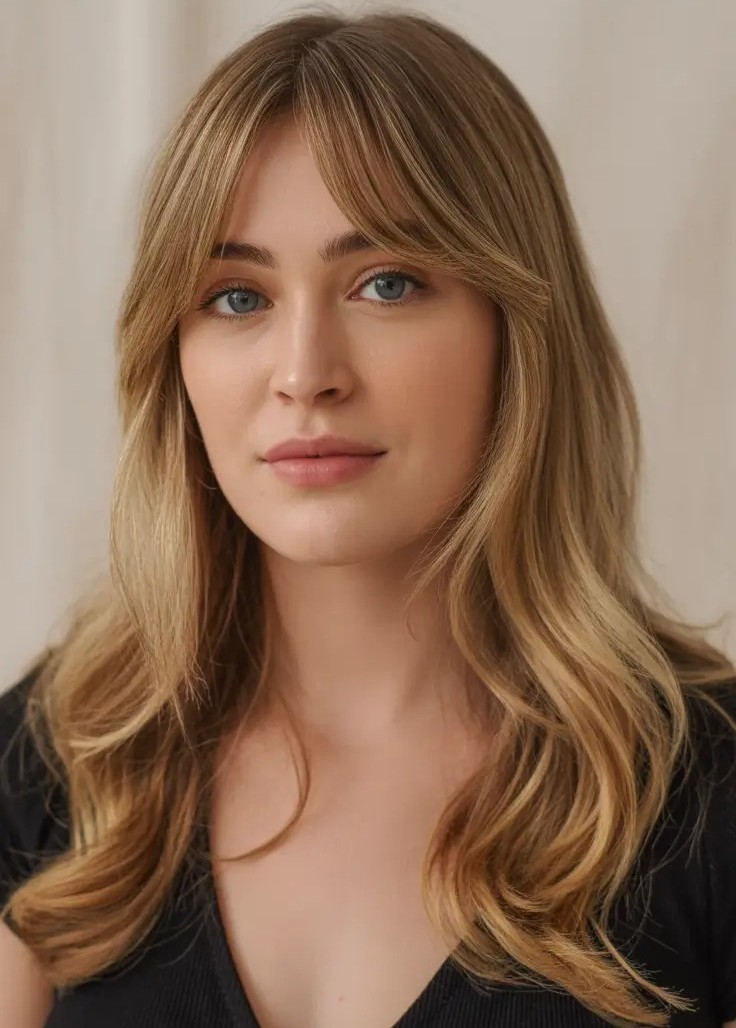 A long layered hairstyle with curtain bangs is a flattering and versatile choice for round faces. The layers add vertical movement which helps to elongate the face while curtain bangs frame the cheeks without adding extra width. Starting the layers just below the chin balances fuller cheeks and softens the jawline. Curtain bangs draw attention to the eyes and cheekbones while creating a slimming effect.