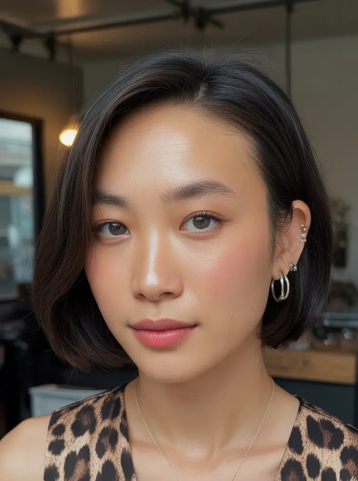 The slightly shorter length, typically around the chin, combined with side-swept bangs which creates angles that elongate the face and soften fuller cheeks. This hairstyle adds structure without harshness, balancing natural curves while maintaining a modern vibe. Textured layers or subtle waves enhance movement and prevent the cut from looking too boxy.