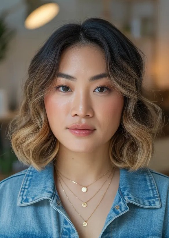 The subtle ombre wavy lob is a perfect choice for round faces, blending soft waves with gentle color transitions to create dimension and movement. The lob, falling just below the chin or to the shoulders, helps elongate the face while balancing fuller cheeks. Side-swept layers or a slight side part add vertical lines, slimming the face and highlighting natural features. The subtle ombre effect draws the eye downward, enhancing the overall shape without adding width.