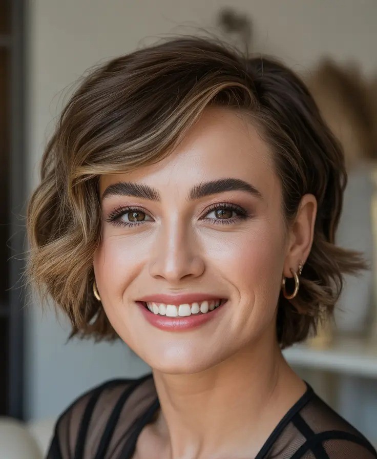 The wavy bob with a side sweep is perfect for round faces, offering softness and flattering angles. Gentle waves add texture and movement, drawing attention away from fuller cheeks while the side-swept style creates a diagonal line that elongates the face. Choosing a bob that hits just below the chin or shoulders balances proportions without adding extra width.